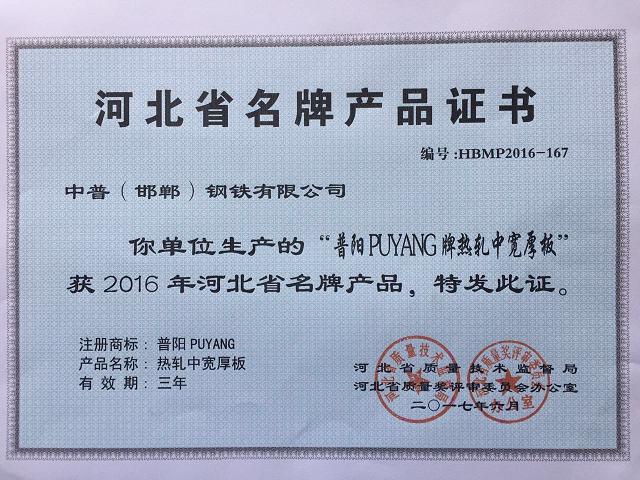 我公司“熱軋中寬厚板”榮獲“2016年河北省名牌產(chǎn)品”稱(chēng)號