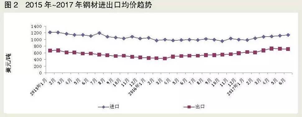 6月份,我國鋼材進(jìn)口均價(jià)為1142.21美元/噸,環(huán)比上漲24.25美元/噸,提高2.17%;1月~6月份,我國鋼材進(jìn)口均價(jià)為1078.18美元/噸,同比上漲83.11美元/噸,提高8.35%。6月份,我國鋼材出口均價(jià)為709.34美元/噸,環(huán)比下跌13.40美元/噸,降低1.85%;1月~6月份,我國鋼材出口均價(jià)為680.33美元/噸,同比上漲213.60美元/噸,提高45.77%。(見(jiàn)圖2)