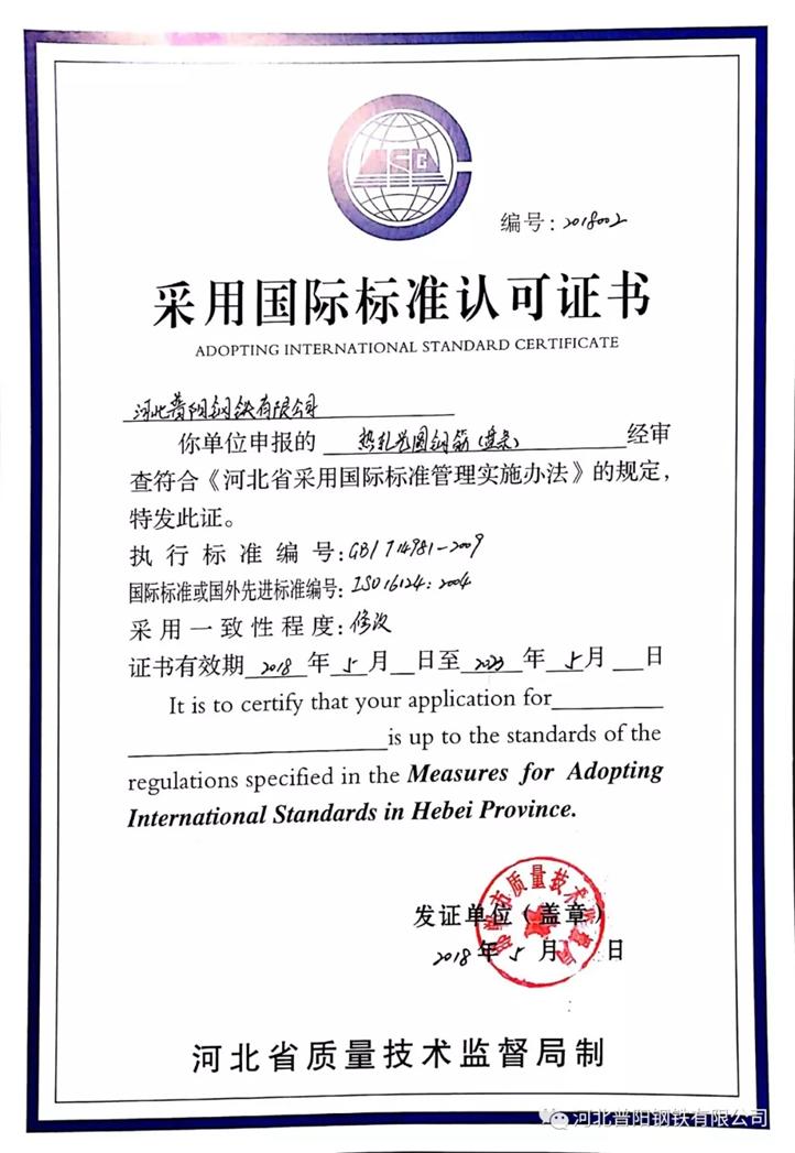 近日,經(jīng)過(guò)國家標準化管理委員會(huì )、河北省質(zhì)量技術(shù)監督局的嚴格檢驗以及行業(yè)專(zhuān)家對產(chǎn)品實(shí)物質(zhì)量與國外同類(lèi)產(chǎn)品質(zhì)量性能指標的比較評估,核定我公司生產(chǎn)的熱軋光圓鋼筋(盤(pán)條)指標完全符合國際標準要求,質(zhì)量達到國際先進(jìn)水平,國家標準化管理委員會(huì )、河北省質(zhì)量技術(shù)監督局特授予《采用國際標準產(chǎn)品標志證書(shū)》和《采用國際標準認可證書(shū)》。這標志著(zhù)我公司的熱軋光圓鋼筋(盤(pán)條)順利通過(guò)“雙采”認證。