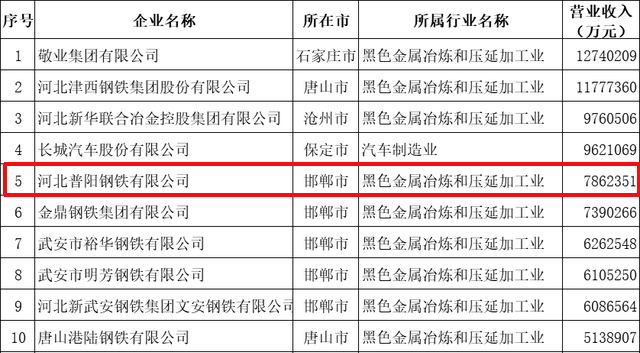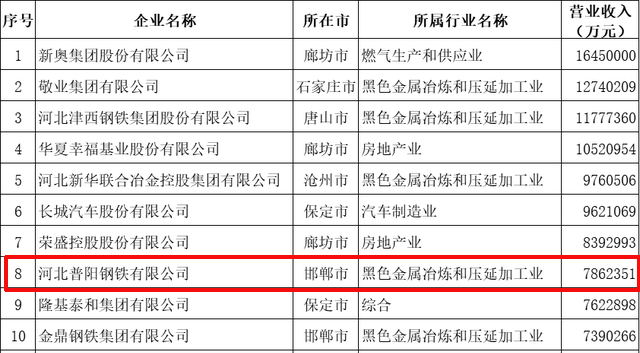 普陽(yáng)以2019年營(yíng)業(yè)收入786億元,居2020河北省民營(yíng)企業(yè)100強第8位、制造業(yè)民營(yíng)企業(yè)100強第5位。