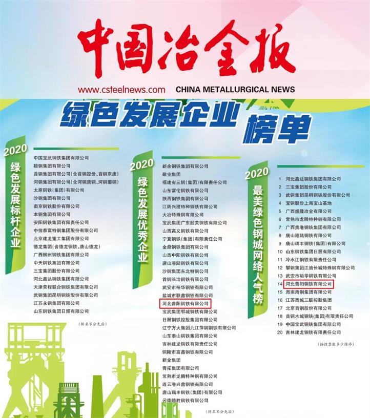 世界環(huán)境日,中國冶金報社發(fā)布綠色發(fā)展企業(yè)榜單。河北普陽(yáng)鋼鐵有限公司憑借卓越的環(huán)保治理社會(huì )貢獻力和公眾認可度,從參評的140家國內知名鋼企中脫穎而出,榮獲“2020年度綠色發(fā)展優(yōu)秀企業(yè)”榮譽(yù)稱(chēng)號,入列“最美綠色鋼城網(wǎng)絡(luò )人氣榜”,這是普陽(yáng)鋼鐵集團去年以來(lái)連續兩次獲評“綠色發(fā)展優(yōu)秀企業(yè)”。
