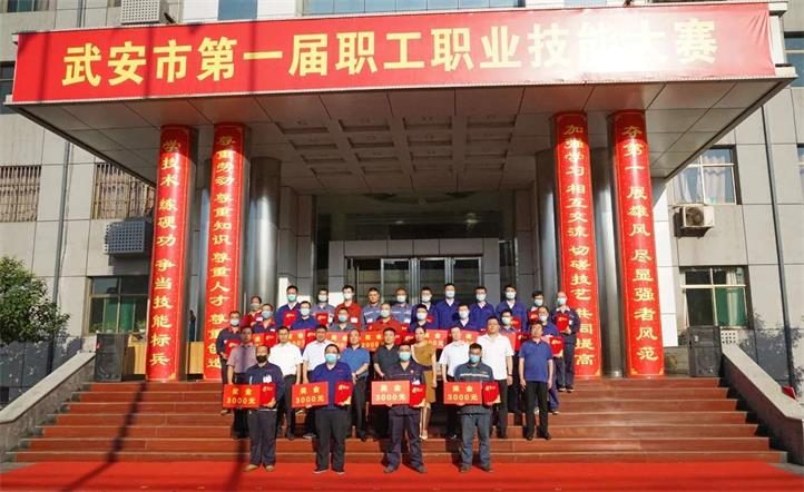 7月25日下午,武安市第一屆職工職業(yè)技能大賽閉幕式在新金鋼鐵舉行,武安市人大黨組成員、二級調研員,總工會(huì )主席張增祥,人力資源和社會(huì )保障局局長(cháng)武秀其,總工會(huì )黨組書(shū)記、常務(wù)副主席高宏偉及各企業(yè)領(lǐng)導出席了儀式,普陽(yáng)鋼鐵集團副總經(jīng)理郭龍?chǎng)螒鱿癁楂@獎選手頒獎。閉幕式由高宏偉常務(wù)副主席主持。