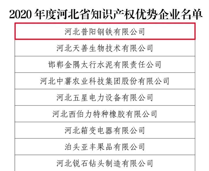 近日,河北省市場(chǎng)監督管理局確定了2020年度河北省知識產(chǎn)權優(yōu)勢企業(yè)名單,河北普陽(yáng)鋼鐵有限公司榮獲“2020年度河北省知識產(chǎn)權優(yōu)勢企業(yè)”稱(chēng)號,這標志著(zhù)普陽(yáng)知識產(chǎn)權管理水平再上新高度。