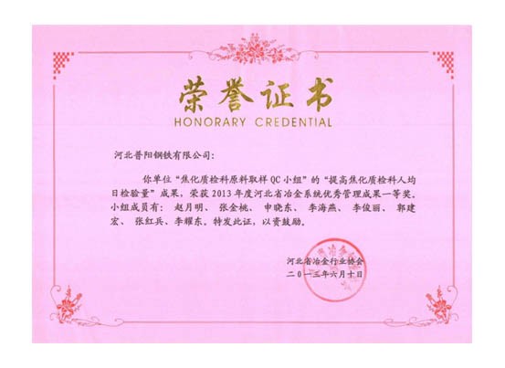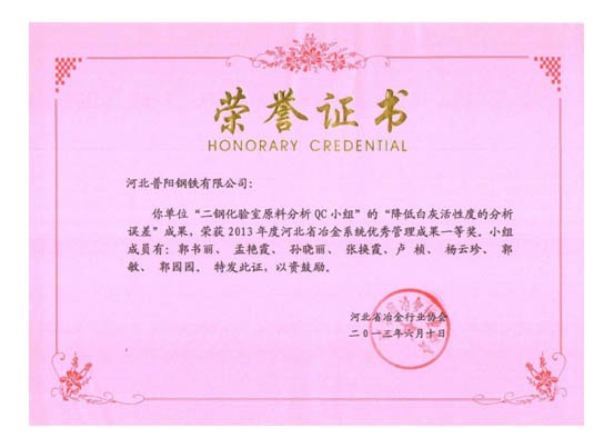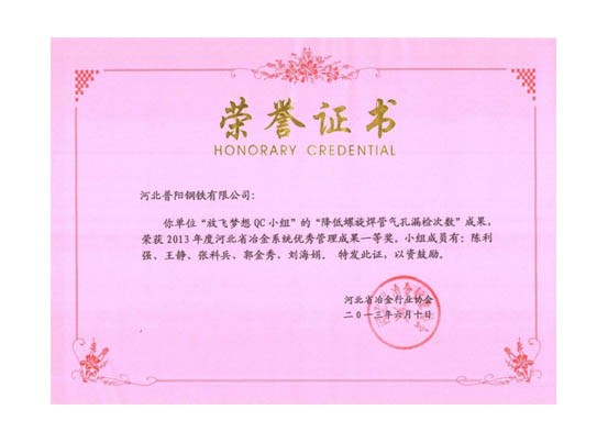 QC小組課題獲得了一等獎8個(gè),二等獎3個(gè)的好成績(jì),同時(shí)公司榮獲“2013年度河北省冶金行業(yè)質(zhì)量管理小組活動(dòng)優(yōu)秀企業(yè)”的稱(chēng)號。