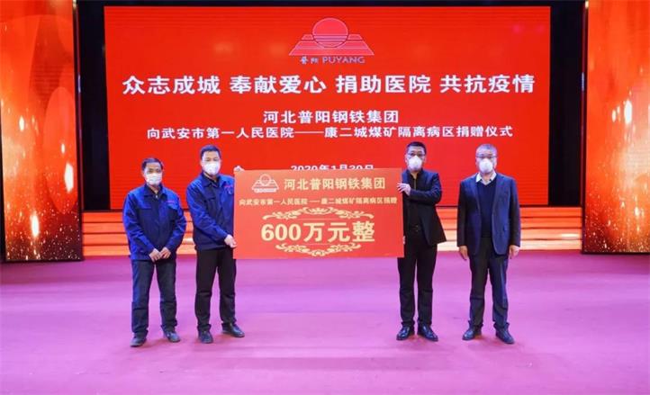 其中,通過(guò)中共武安市委統戰部和市工商聯(lián)向中國光彩基金會(huì )捐獻人民幣3136.25萬(wàn)元(含員工捐款136.25萬(wàn)元),定向用于武漢地區的疫情防控工作。為大力支持武安市疫情防控工作,普陽(yáng)鋼鐵集團向武安市第一人民醫院(康二城煤礦隔離病區)捐獻人民幣600萬(wàn)元,定向用于采購必備的醫療物資。
